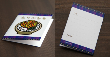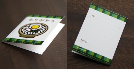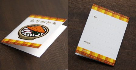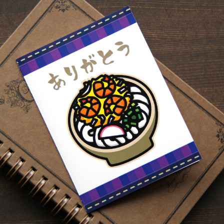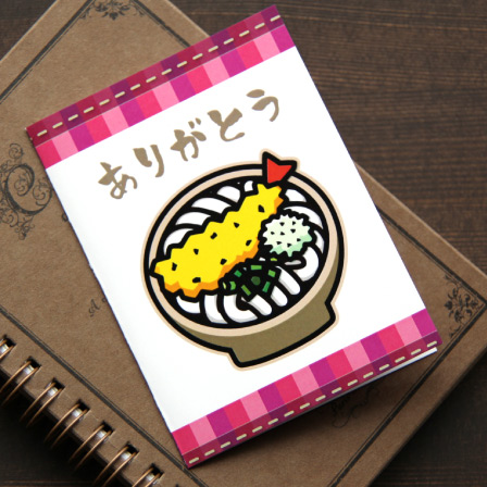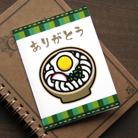 | 毎日うどんのイラストの入ったグリーティングカードです。表紙には「ありがとう」の文字が入っています。メッセージカード、ギフトカード、おみやげもののカードとしてお使いいただけます。 [サイズ・素材] 75×100(mm) 二つ折り加工済 紙製 全5種類 |