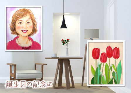 | ご家族やお世話になった方、お友達など、誕生日の記念に贈るプレゼント。似顔絵はメッセージ入りで想いを伝えて。アートはその方の好きなもの・色を選んでプレゼントしましょう。アートは玄関やプライベート空間に飾って、その時のことを思い出しながら会話が弾みます。 |