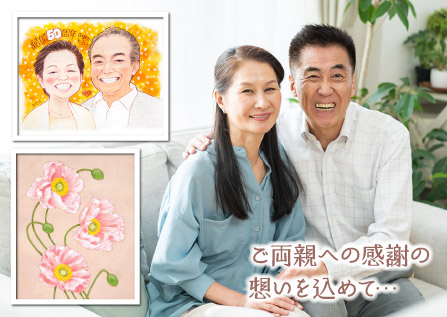 | ご両親の結婚記念日、パートナー、子ども、孫からのプレゼント。また父の日、母の日にお子さんから贈る贈答品として、似顔絵、肖像画、アートをご用意しております。ご両親のお顔や、お部屋を明るく楽しくするアートを、日頃お世話になっている両親に、気持ちを伝えるアイテムとして、ご利用ください。 |