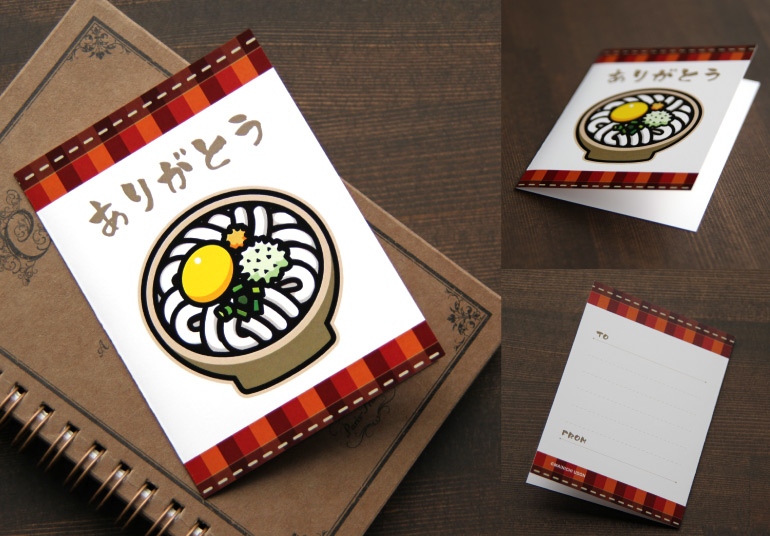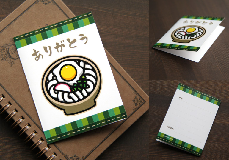 毎日うどんのイラストの入ったグリーティングカードです。表紙には「ありがとう」の文字が入っています。メッセージカード、ギフトカード、おみやげもののカードとしてお使いいただけます。